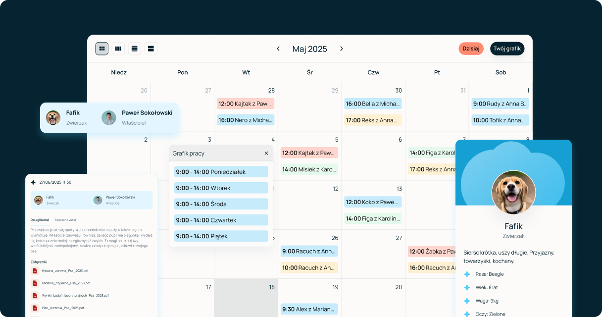 Łatwe zarządzanie grafikami specjalistów, pełny wgląd w obłożenie. Każdy weterynarz sam układa harmonogram. Elastyczność i doskonała koordynacja w placówce.